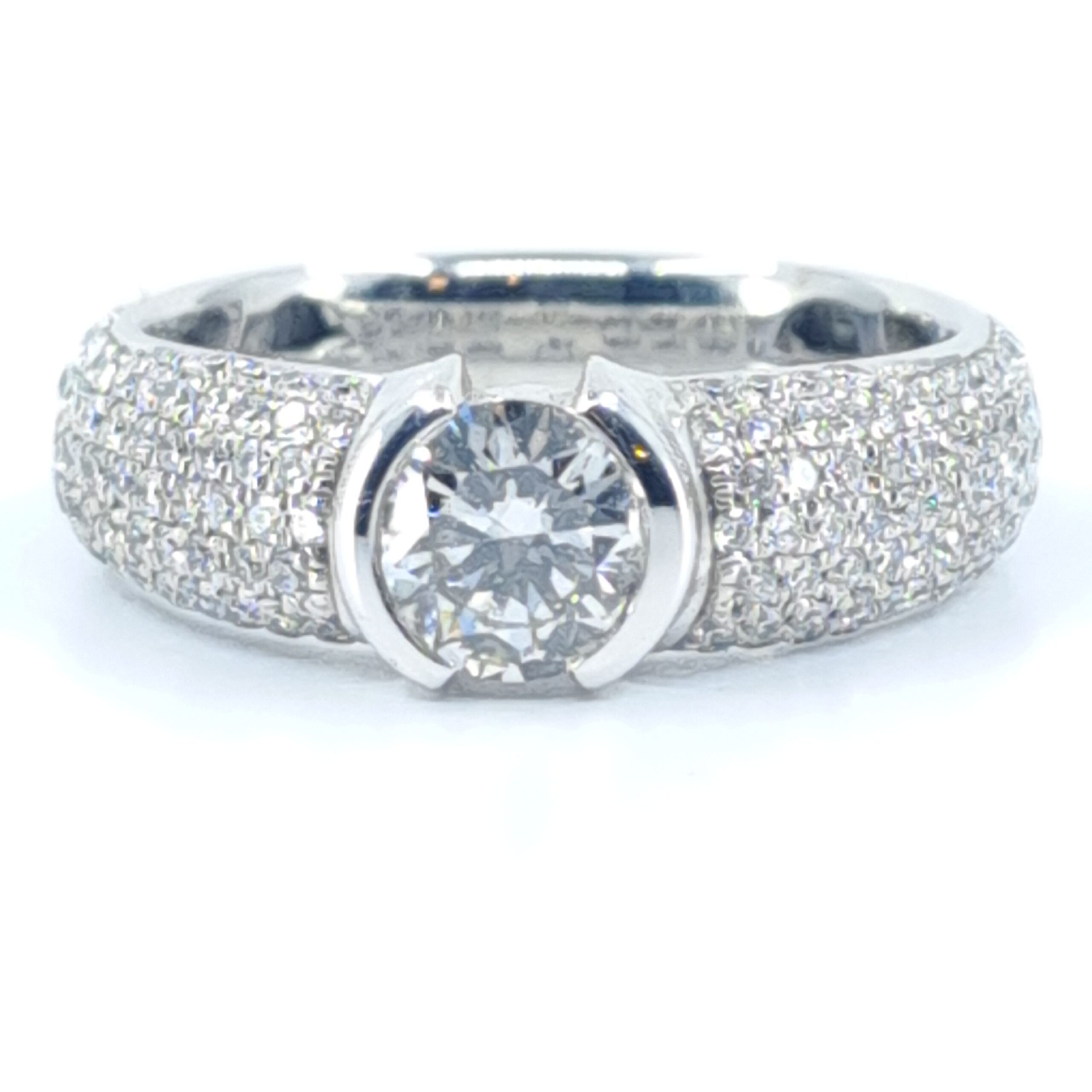 This luxury 18K gold diamond ring showcases a brilliant 0.63Ct F VS2 center diamond paired with 1.80Ct pavé-set diamonds on the shoulders for maximum sparkle. A perfect engagement ring, anniversary ring, or fine jewelry piece for those who love classic, high-quality diamond design.