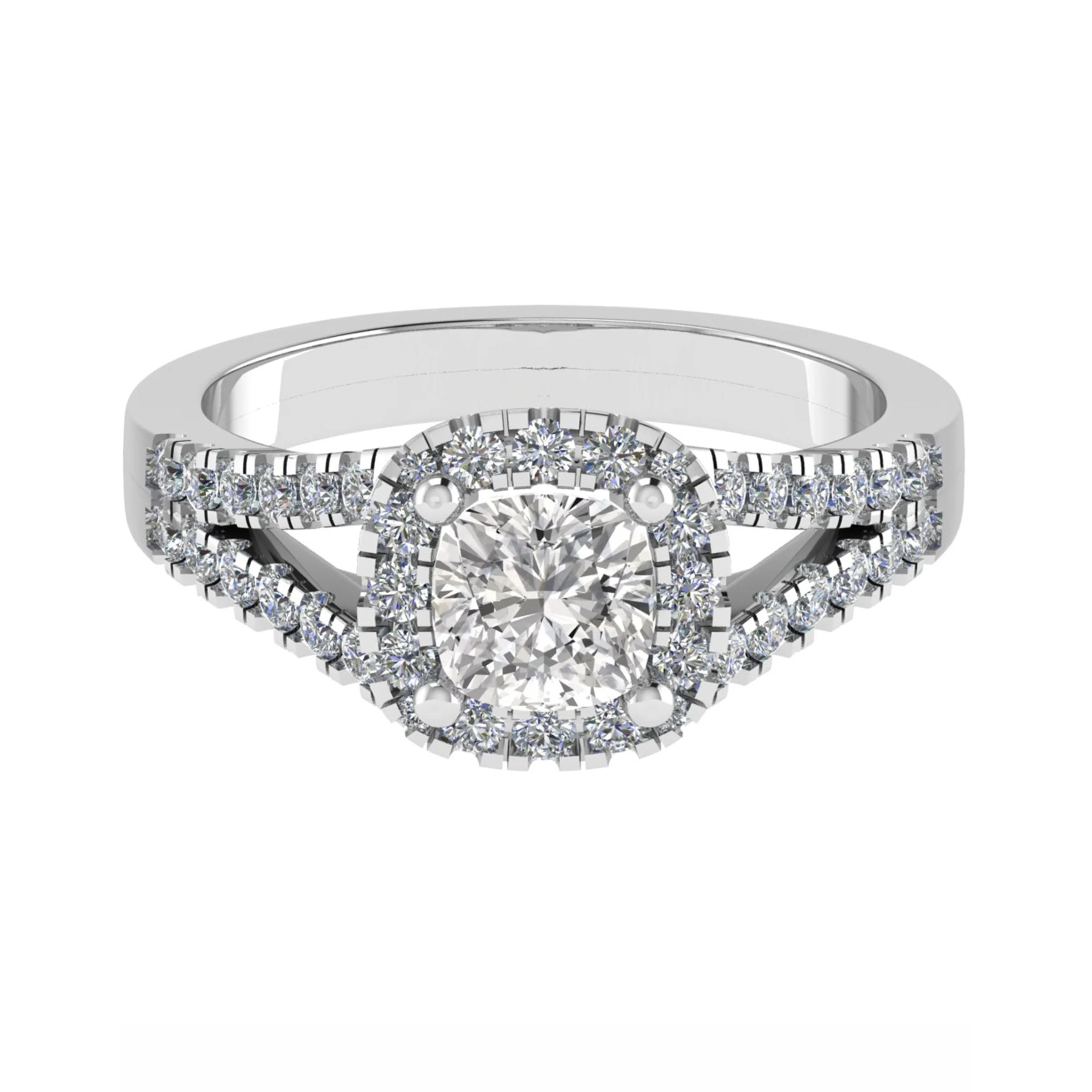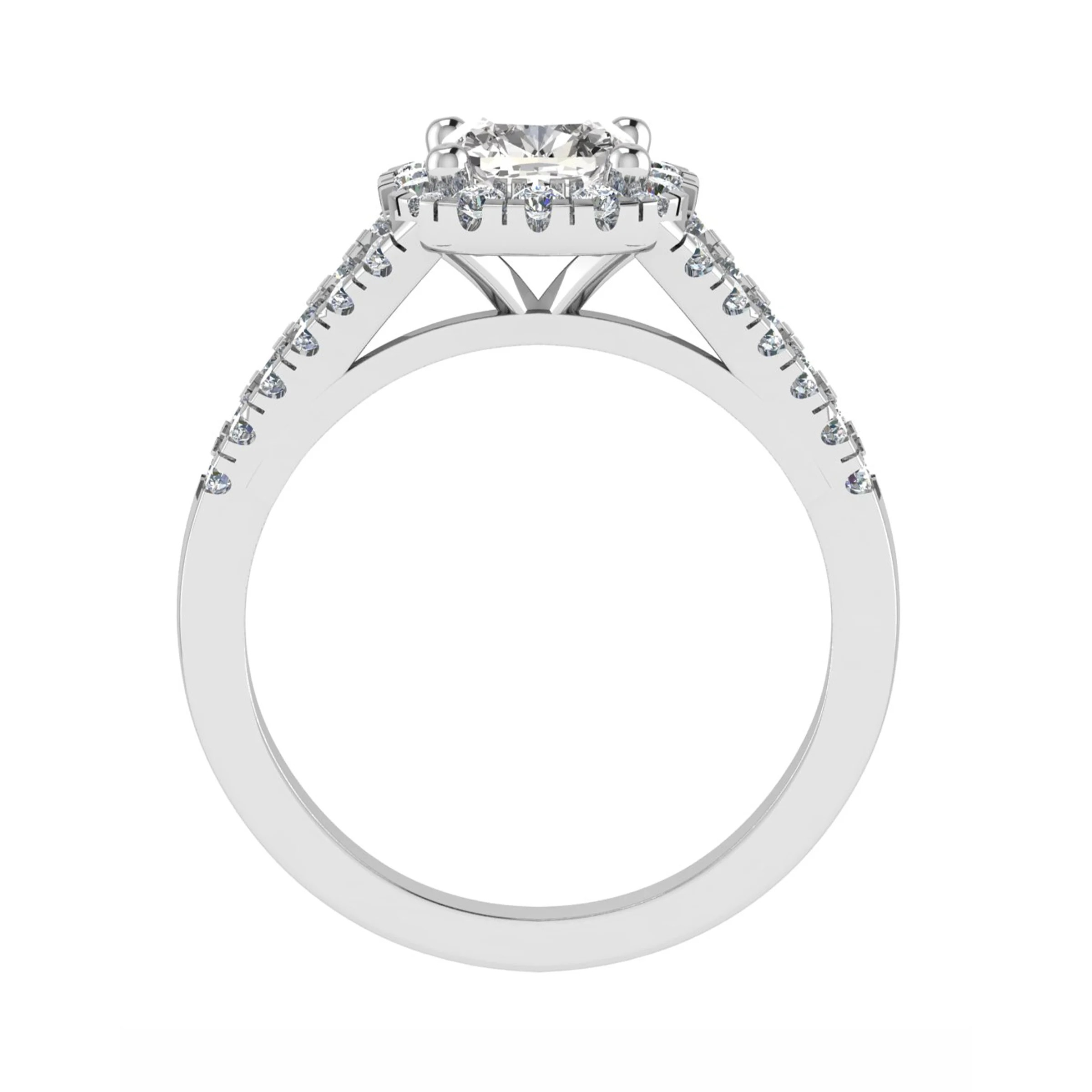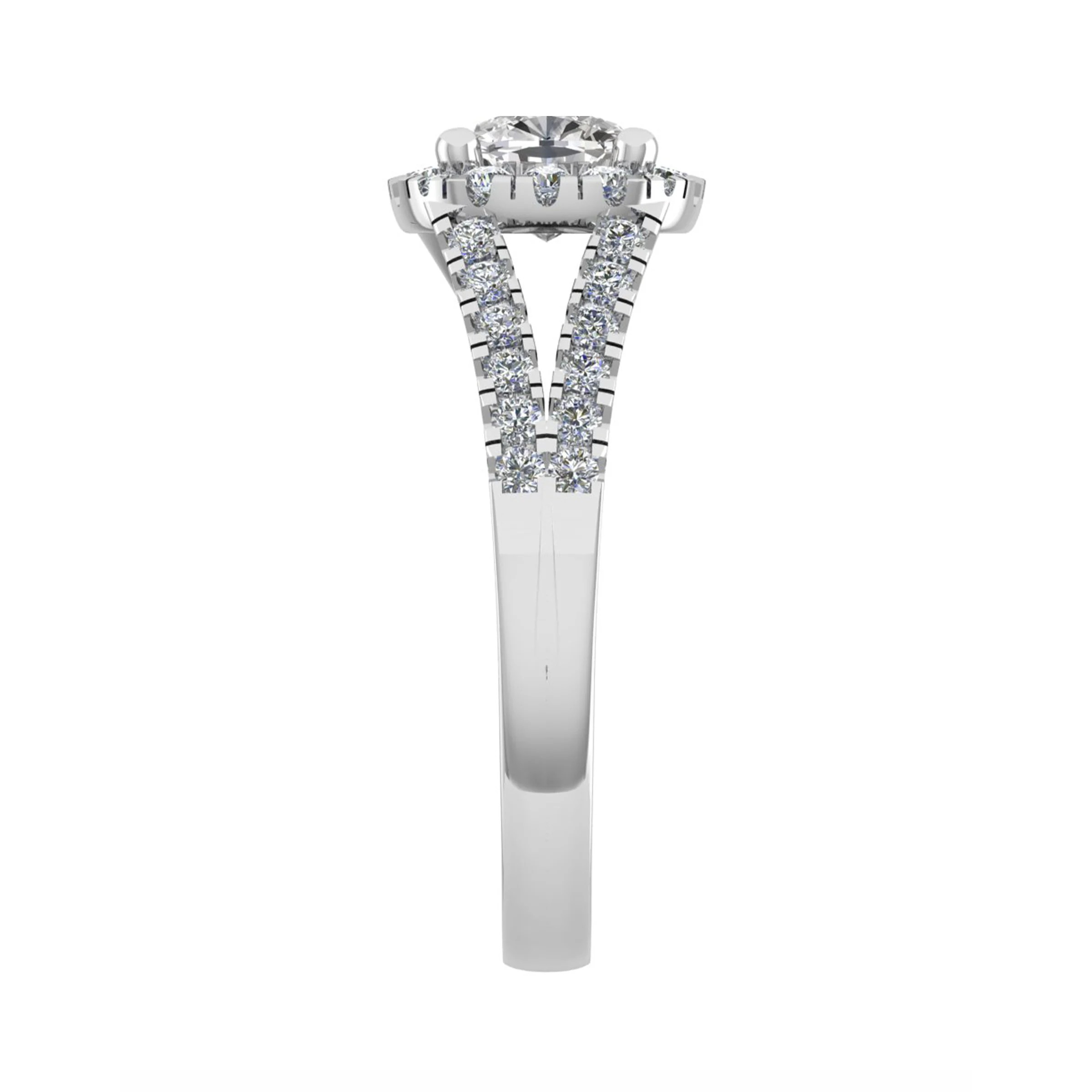 Very shinny engagement ring with halo setting and split shank set with pavé diamonds.