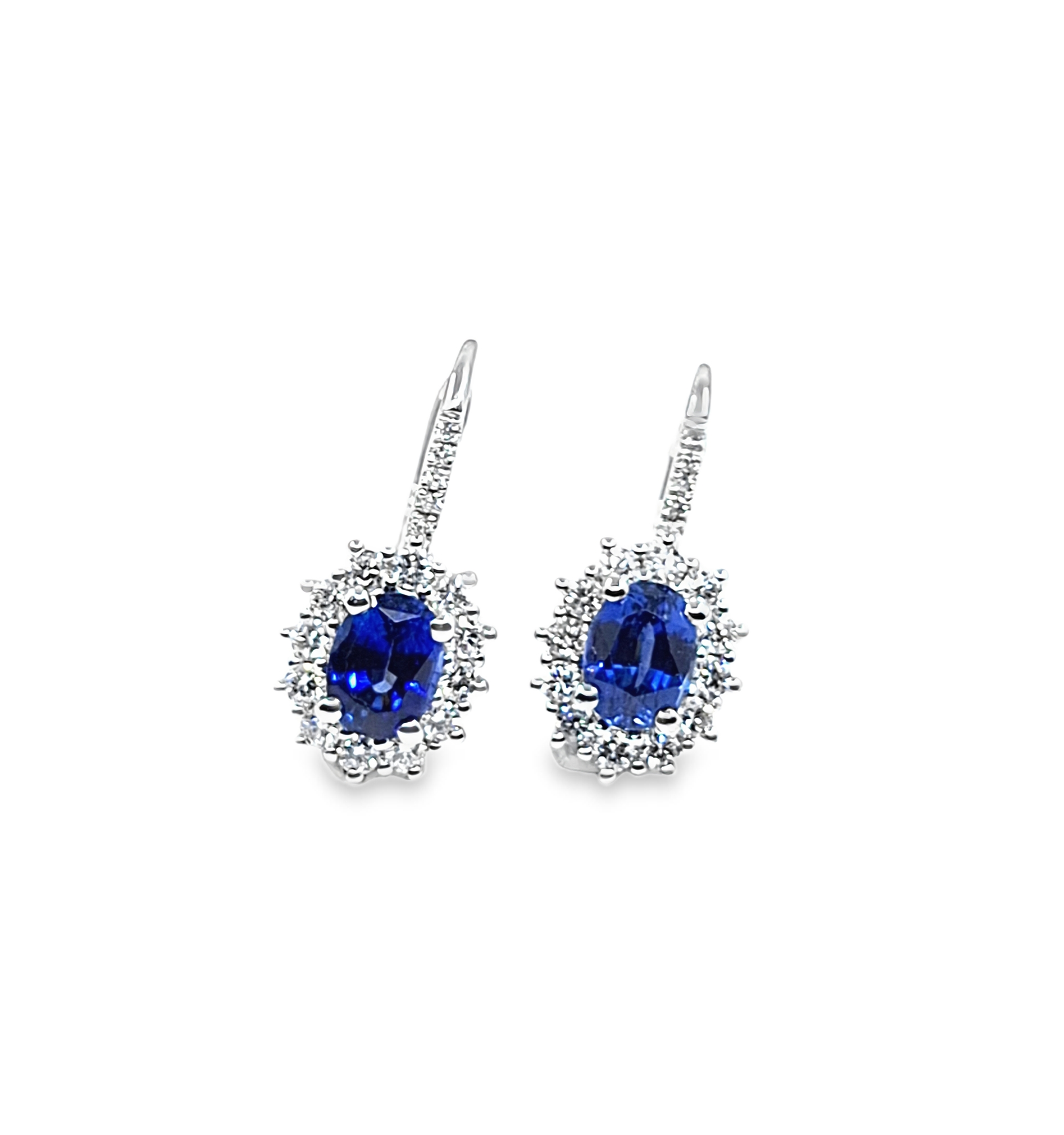 Very elegant earrings with a beautiful contrast between the blue of the oval-shaped Sapphire and the white of the surrounding diamonds. Royal Blue Sapphires with a total of 1.60 ct and diamonds 0.92 ct in F color and VS clarity.